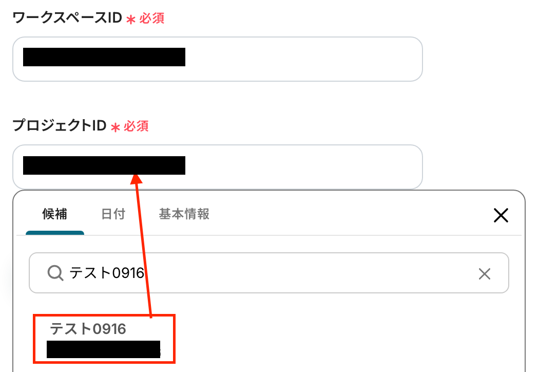 「ワークスペースID」と「プロジェクトID」は、以下の画像のように入力欄をクリックすると候補が出てくるので該当するものをクリックしましょう。