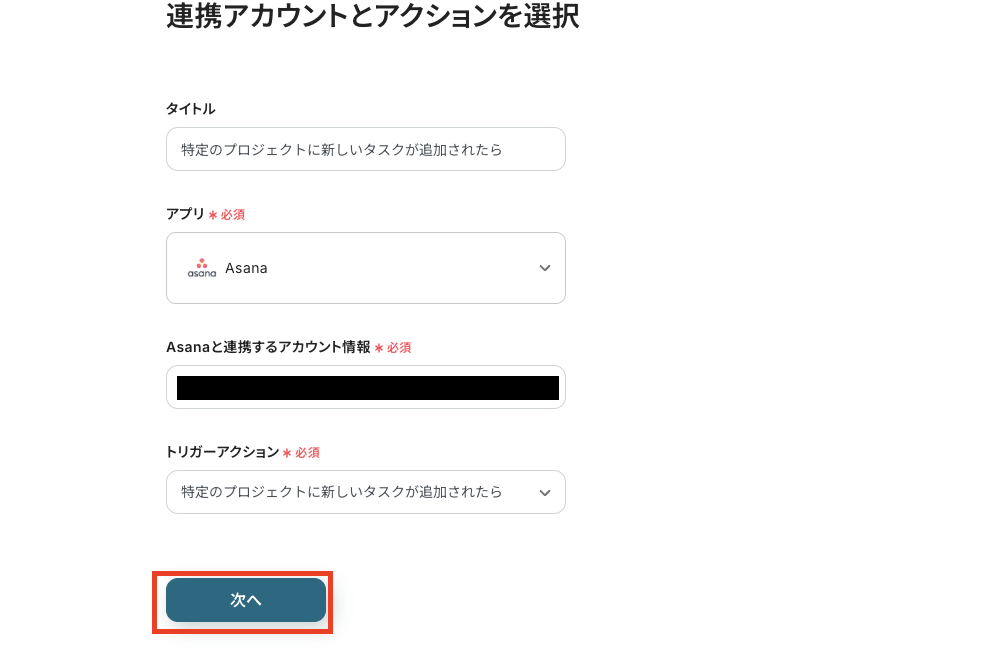 こちらはすでに設定が完了しているアクションなので、内容を確認し、[次へ]をクリックしてください。