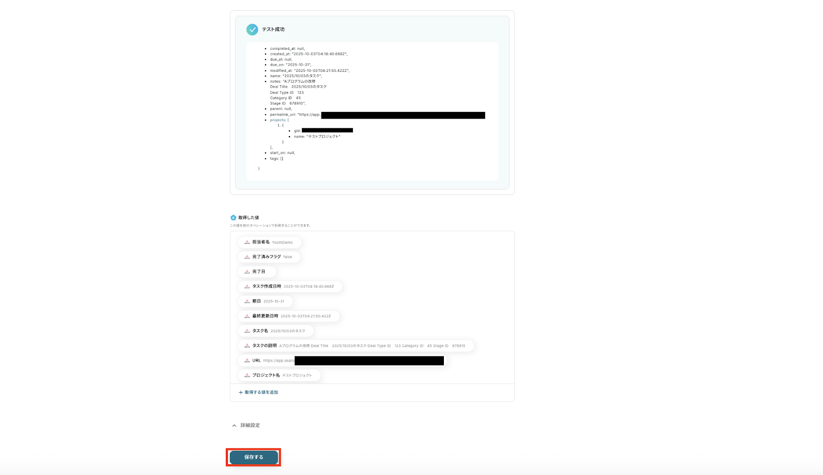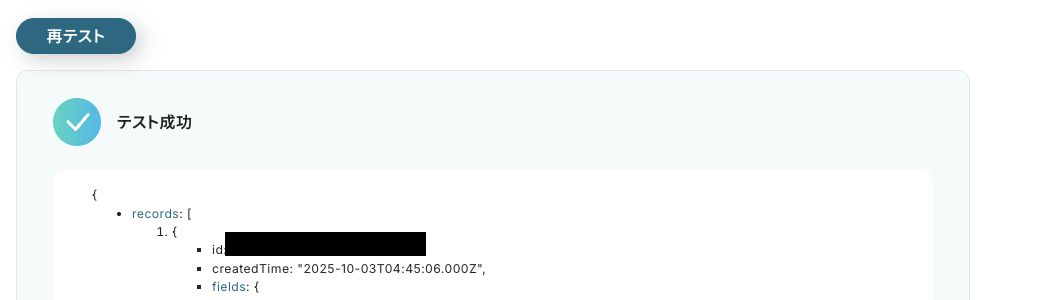 設定後、[テスト]を押しましょう。テストに成功すると、指定した内容で情報を取得できました!