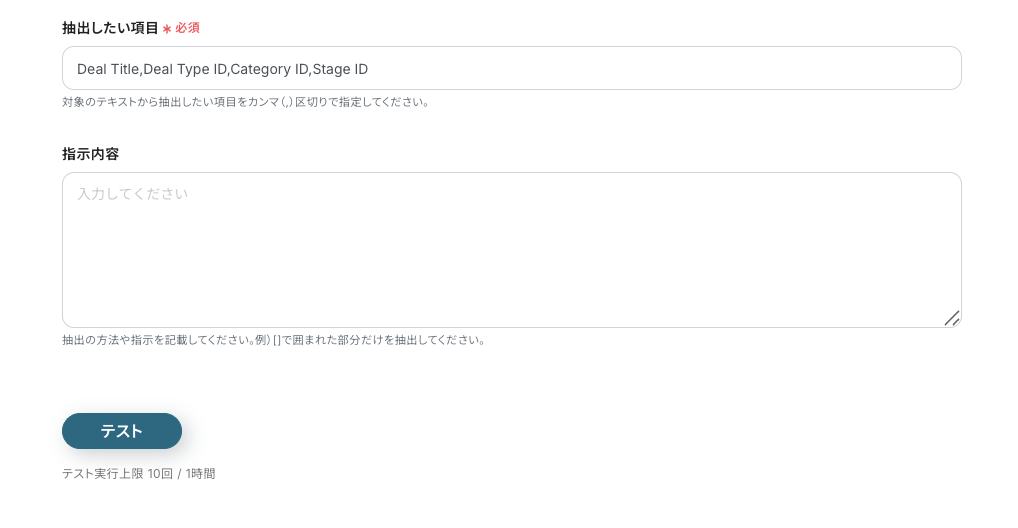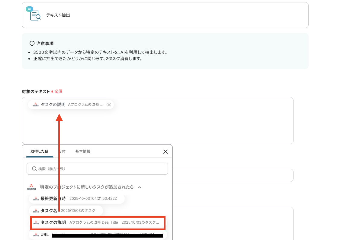 今回は、前ステップで取得した値「タスクの説明」を指定し、「抽出したい項目」や「指示内容」を以下のように設定しました。(入力ボックスをクリックすると、以下のように【取得した値】が表示されます。)
