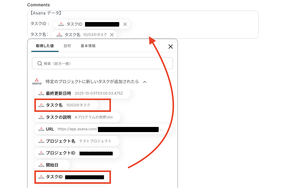 他にも、タスク名や担当者だけでなく、期日、プロジェクトIDといった、Asanaで登録した詳細なデータを変数として取得しBitrix24のCommentsへ反映することが可能です。