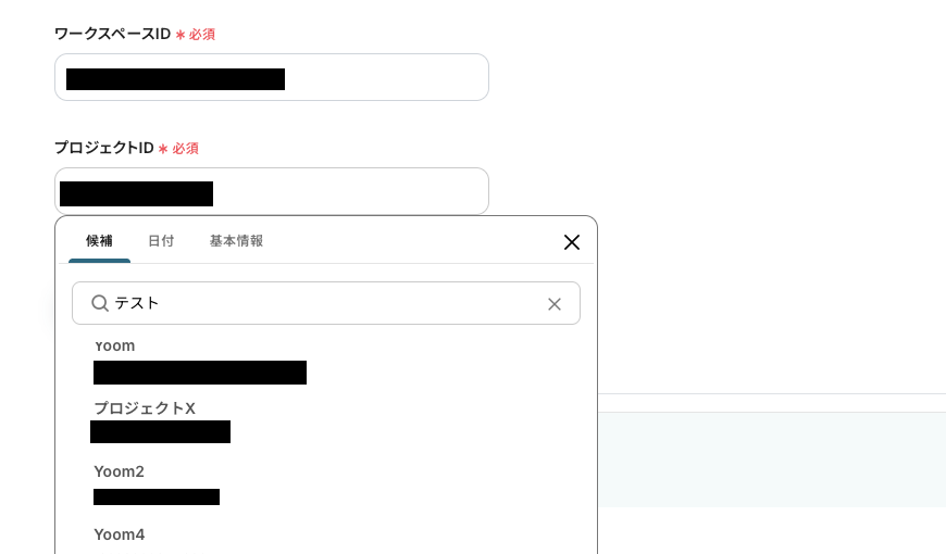 「ワークスペースID」と「プロジェクトID」は、入力バーをクリックすると『候補』に連携したアカウントに基づいた情報が表示されます。