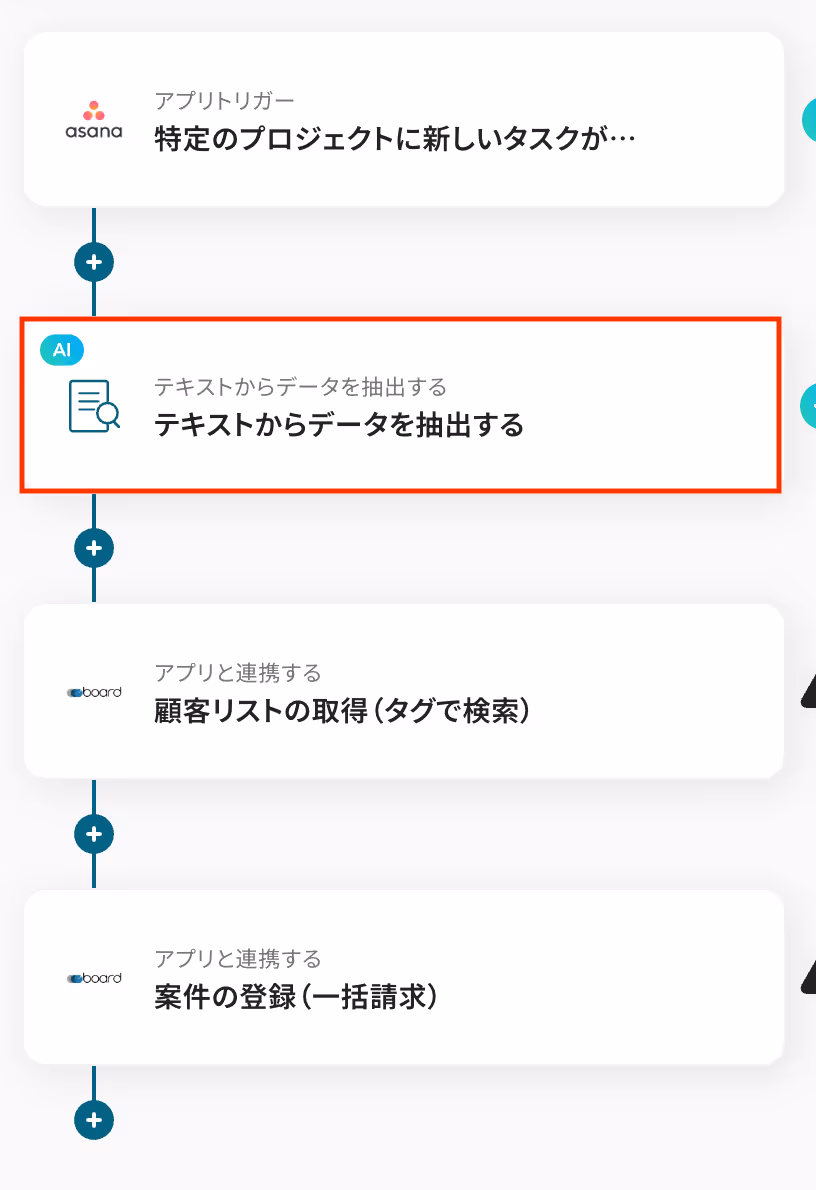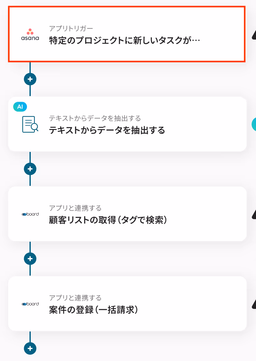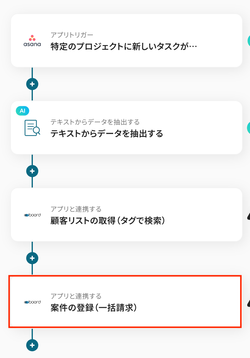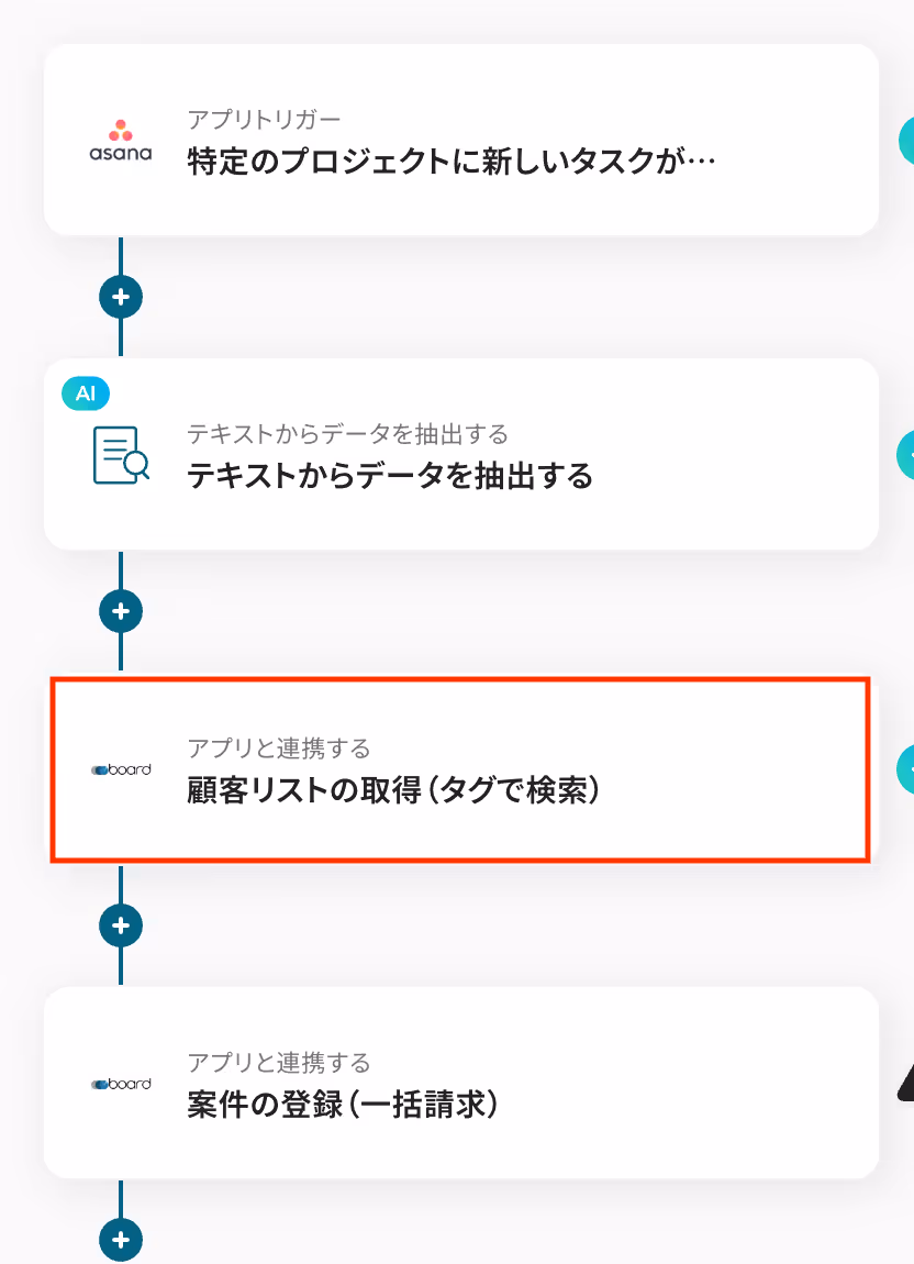 今回のフローでは、Asanaに追加した新規タスクに含まれる顧客名をAIが抽出し、board上の顧客リストと照合(タグで検索)して案件を登録します。