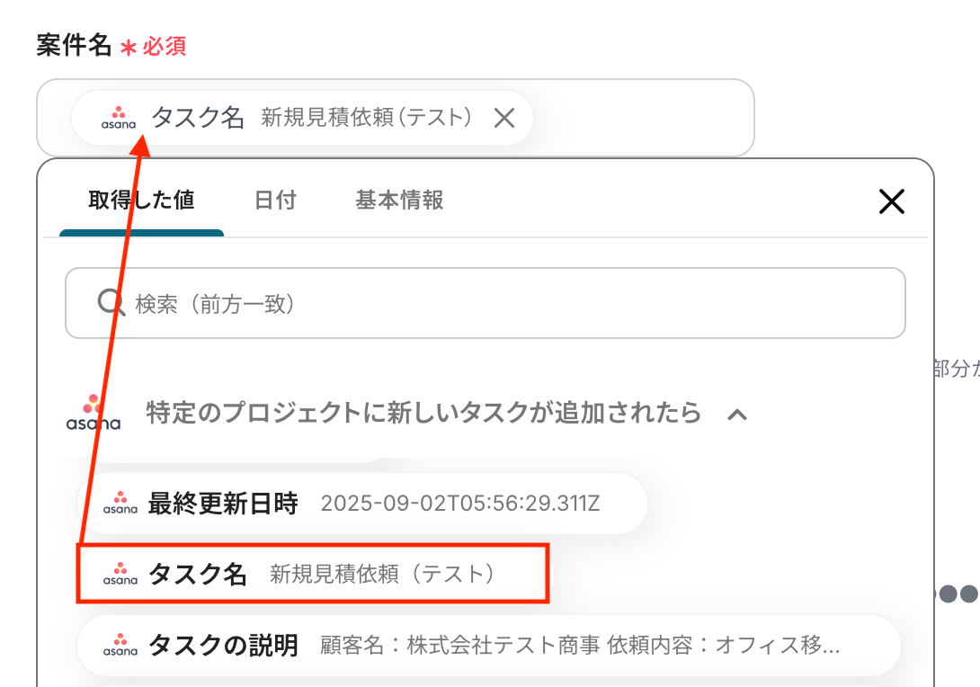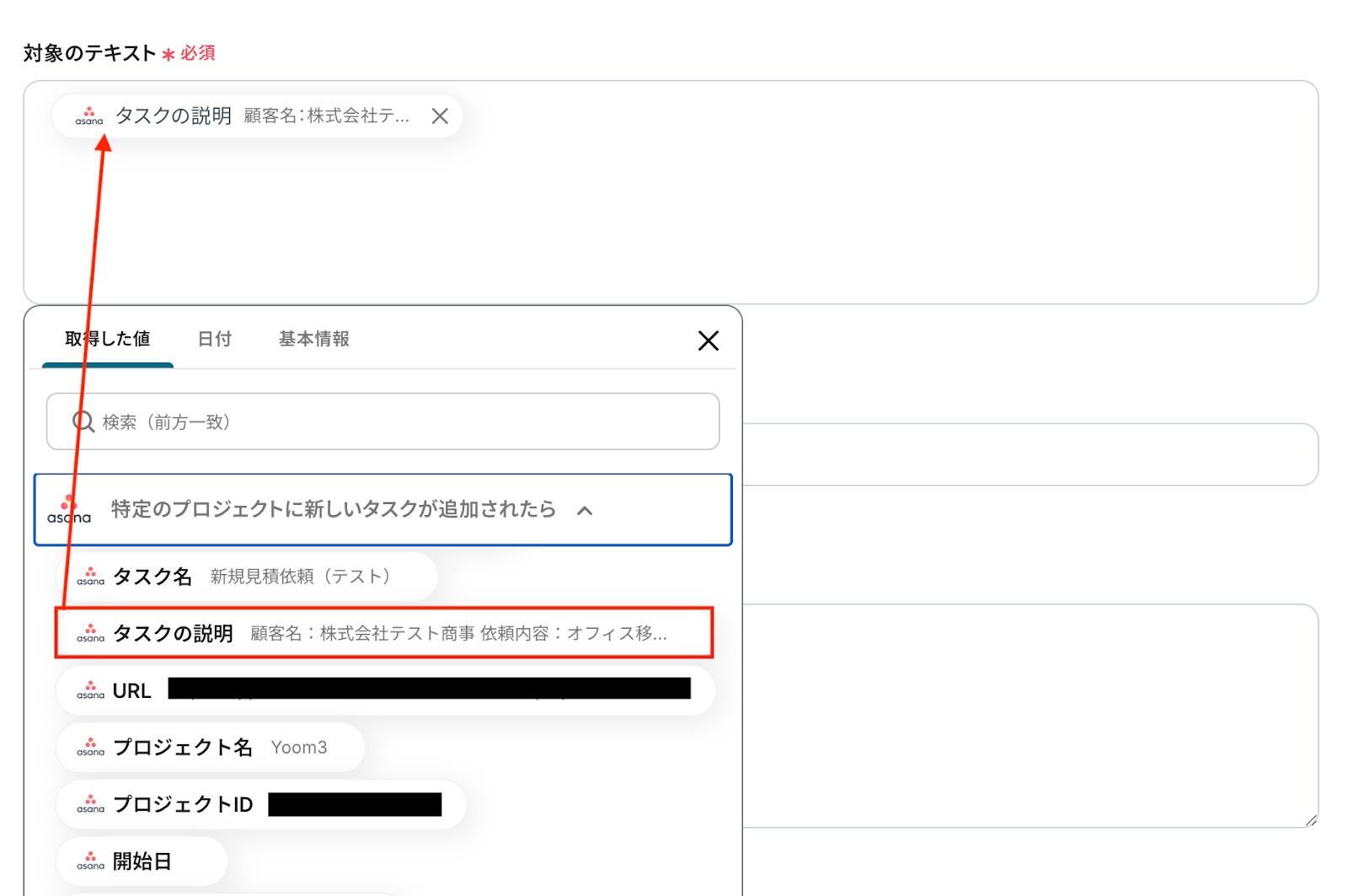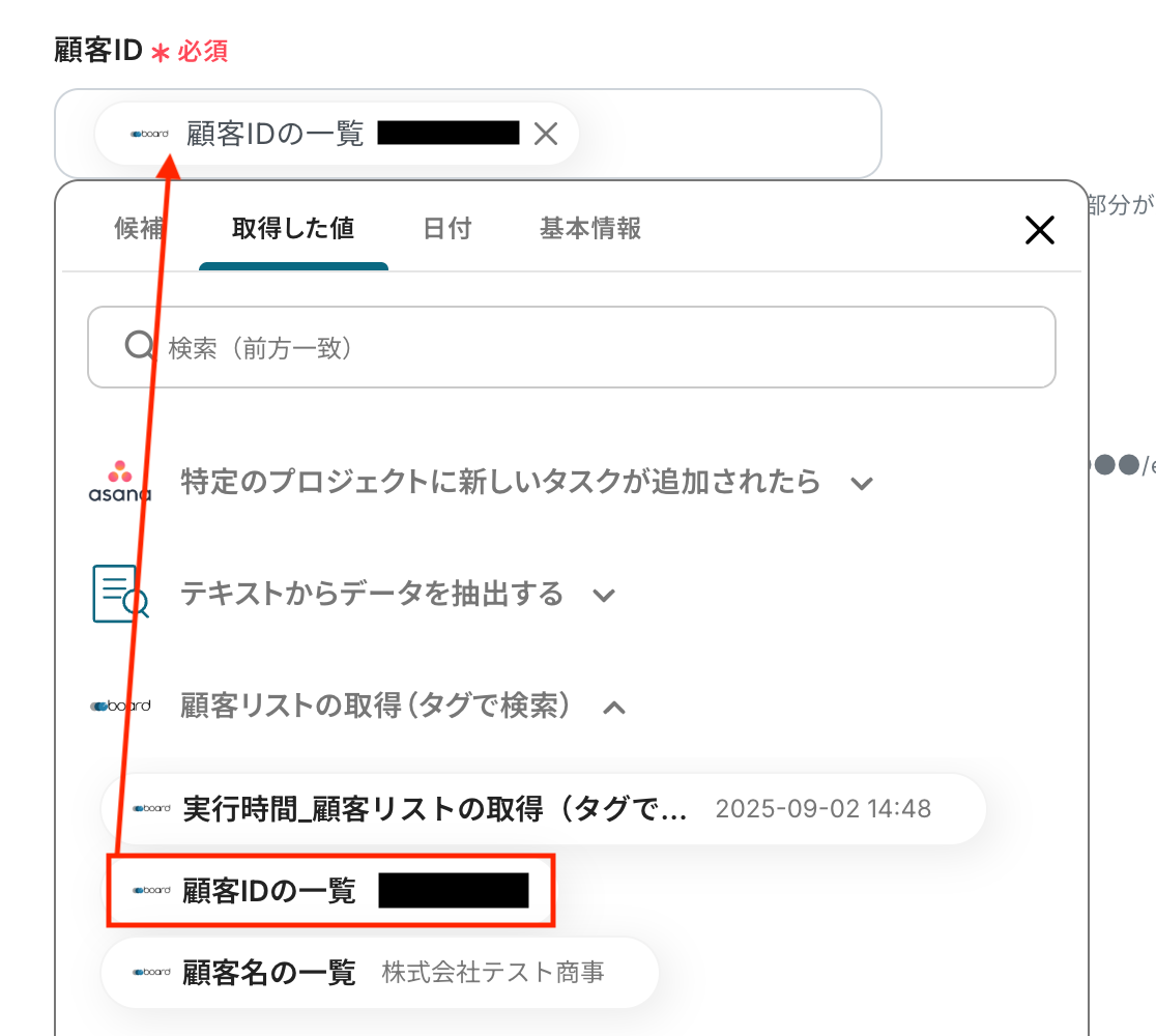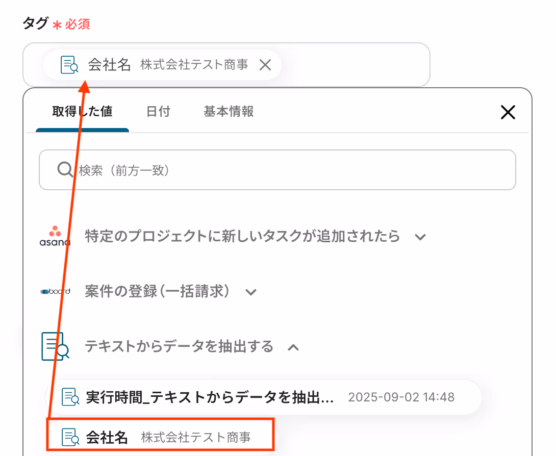 今回のフローでは、Asanaに追加した新規タスクに含まれる顧客名をAIが抽出し、board上の顧客リストと照合(タグで検索)して案件を登録します。