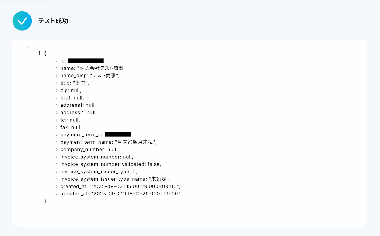 テストが成功すると、取得された顧客リストの情報が一覧で表示されます。