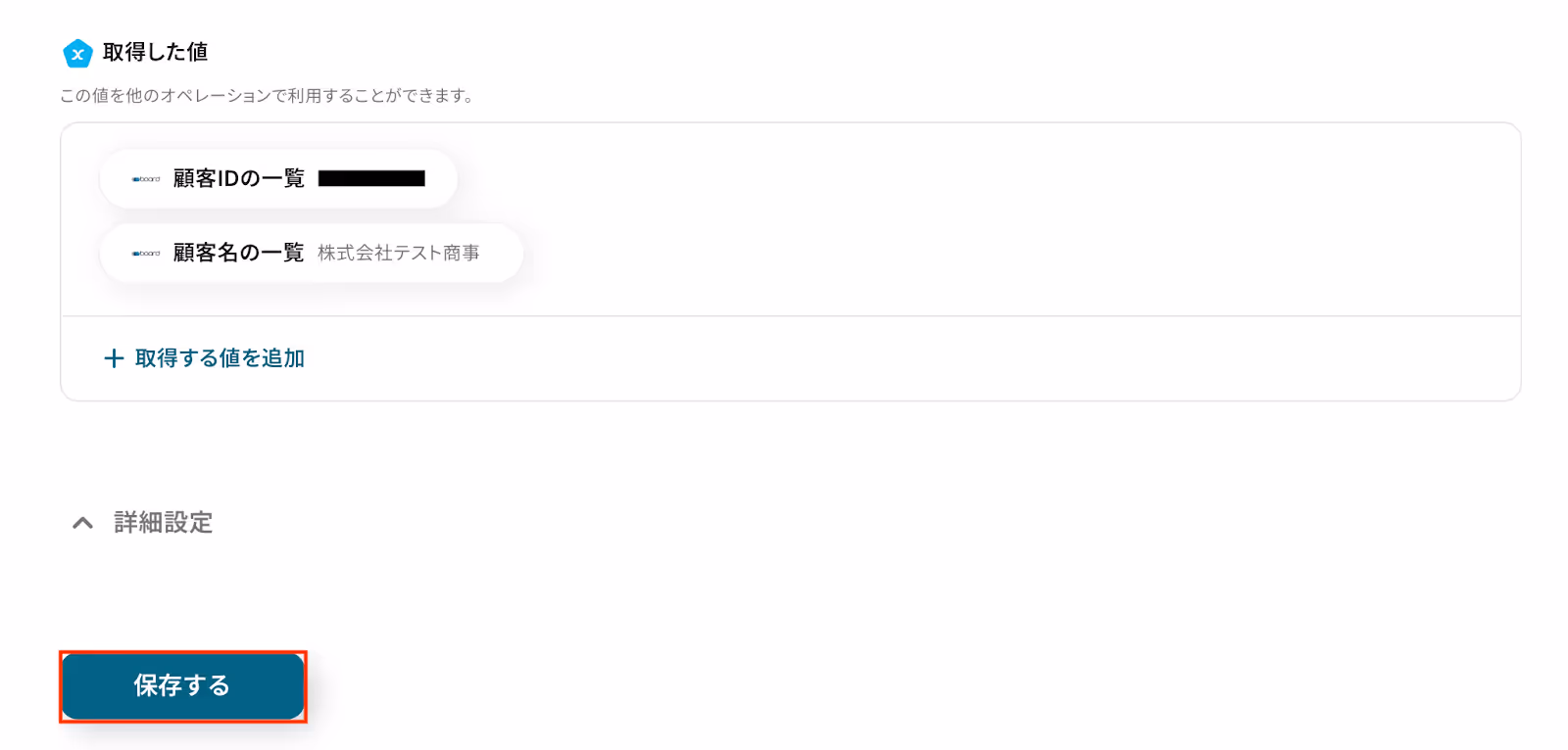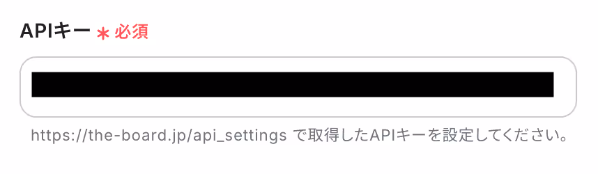 なお、テキストを直接入力した部分は固定値とされるため、取得した値を活用せず設定を行うと毎回同じデータがboardに登録されてしまうので注意が必要です。