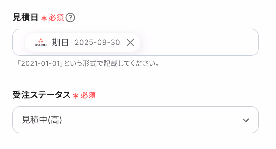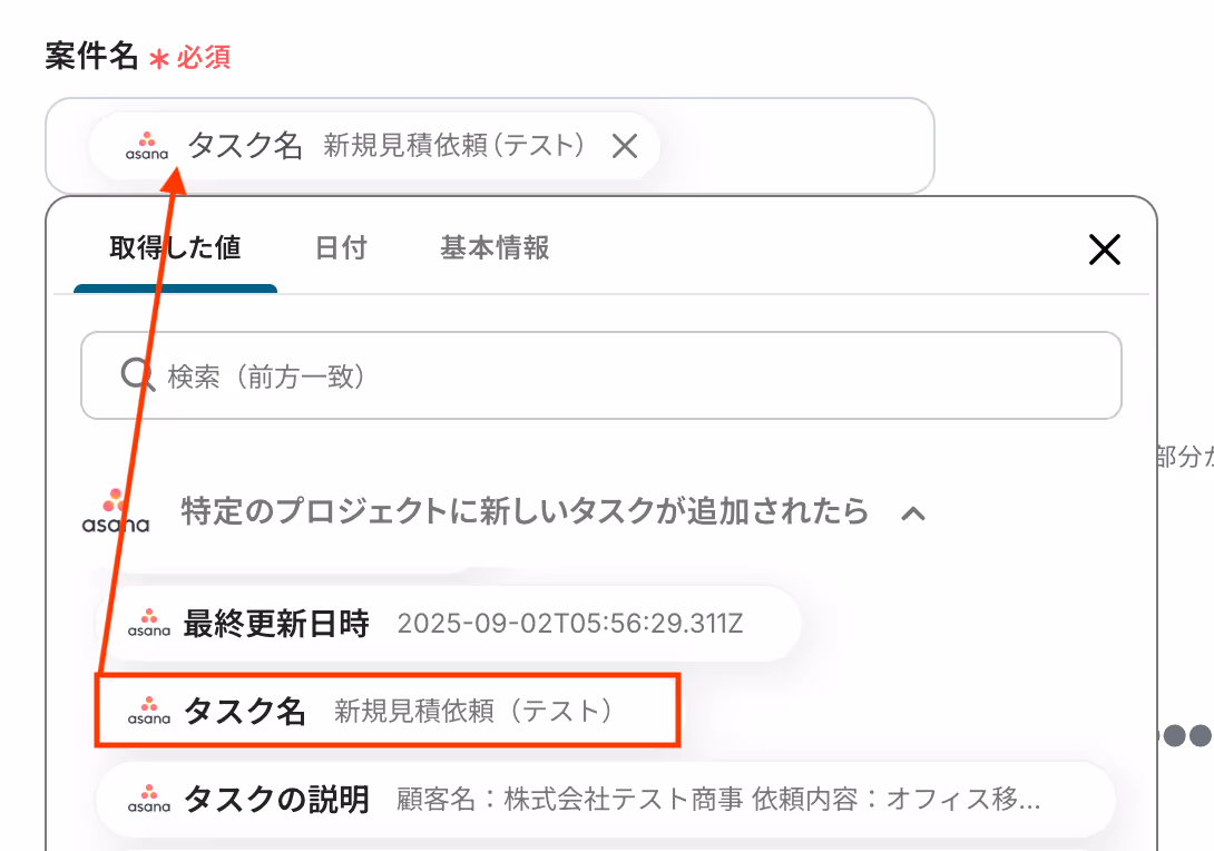 入力欄をクリックすると、前のステップでAsanaから取得した値が表示されるので、選択して入力しましょう。