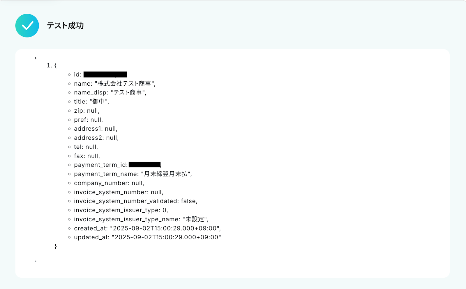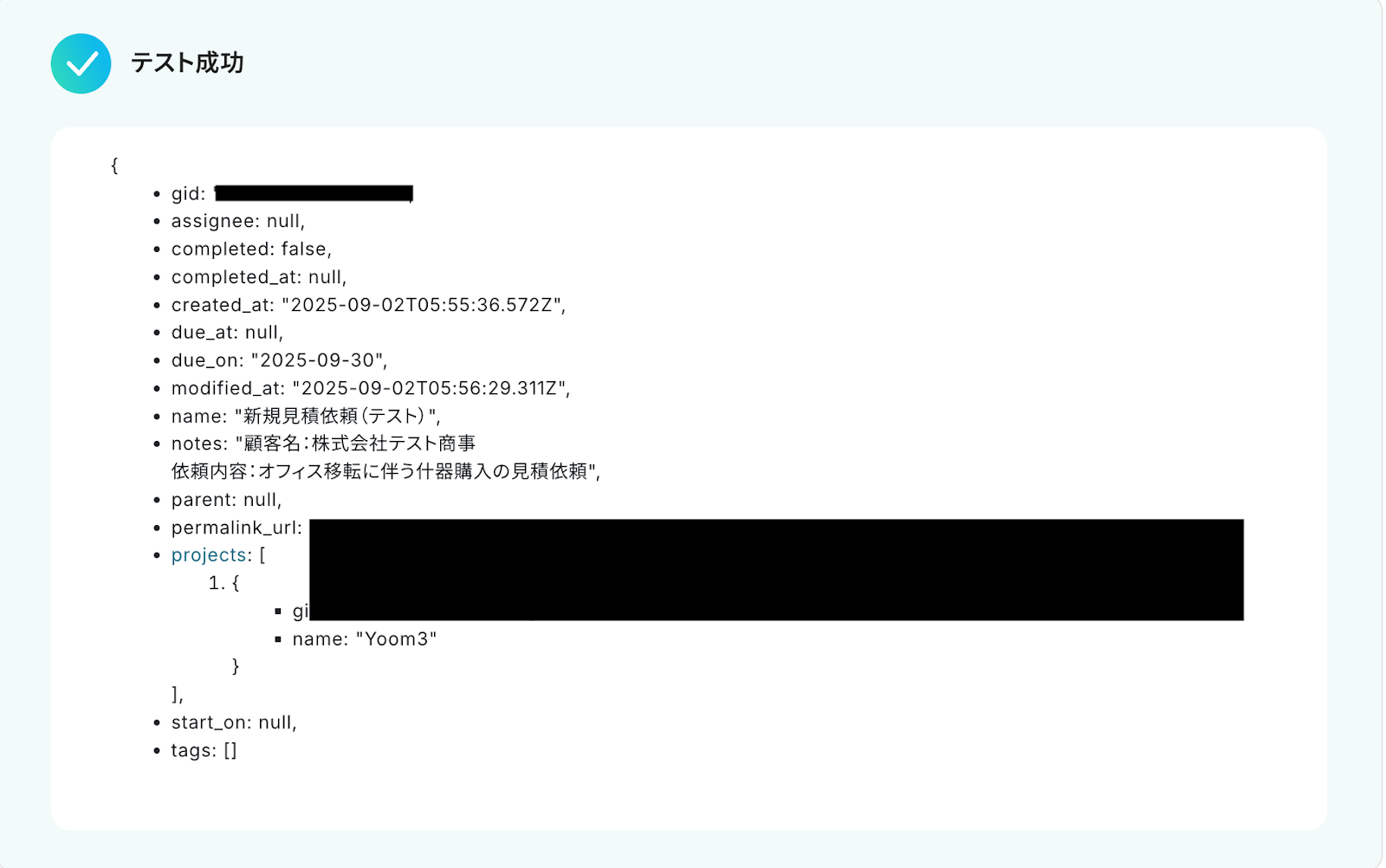 入力が完了したら「テスト」をクリックして、設定した内容で案件の登録が行われるか確認しましょう。