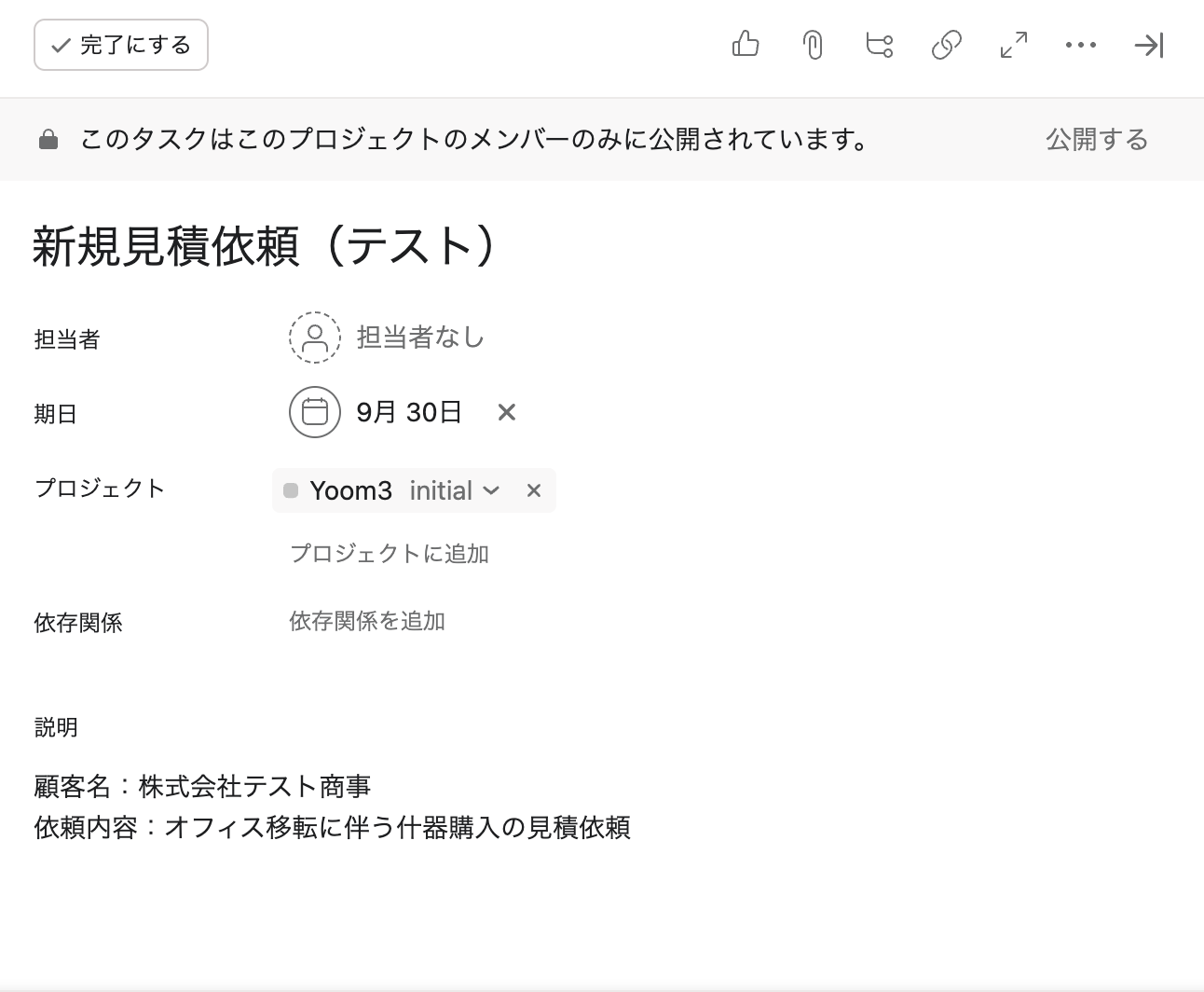 この自動化によって、案件発生からタスク作成までのリードタイムを短縮し、対応漏れを未然に防ぐことができるため、プロジェクトの迅速なスタートダッシュを支援します。