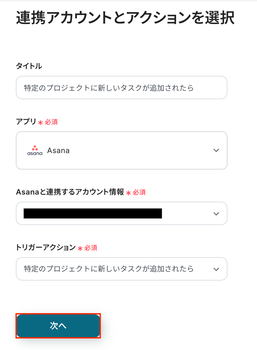 Asanaと連携するアカウント情報に問題がなければ、「次へ」をクリックします。