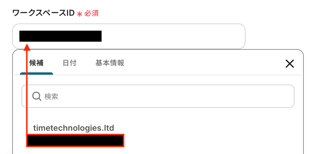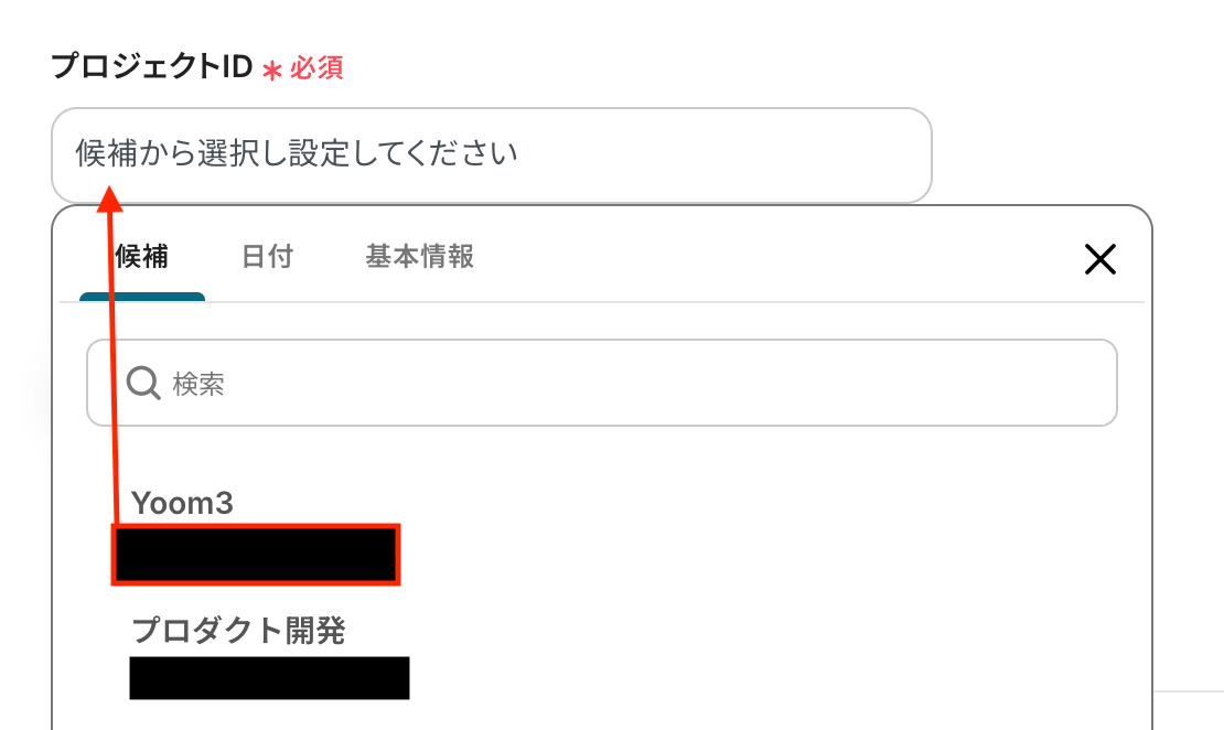 入力欄をクリックすると連携が有効になっているアカウントから候補が表示されるので、対象の項目を選択しましょう。