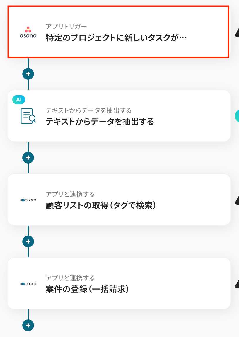 このワークフローは、Asanaとboardを連携させ、特定のタスクが完了すると自動でboardに顧客情報が登録される仕組みを構築します。