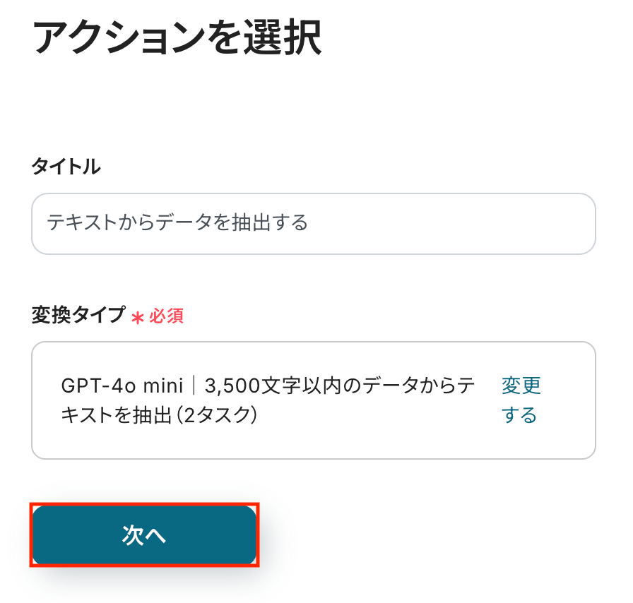 アプリとアクションはあらかじめ設定されているため、そのまま内容を確認してください。