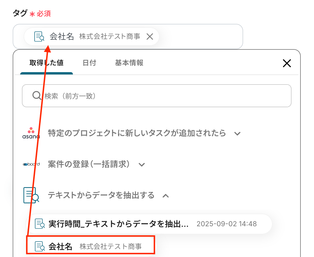 ・Asanaのタスクの説明欄に会社名が登録されていること、boardに登録の会社名がタグとして追加されていることを前提としています