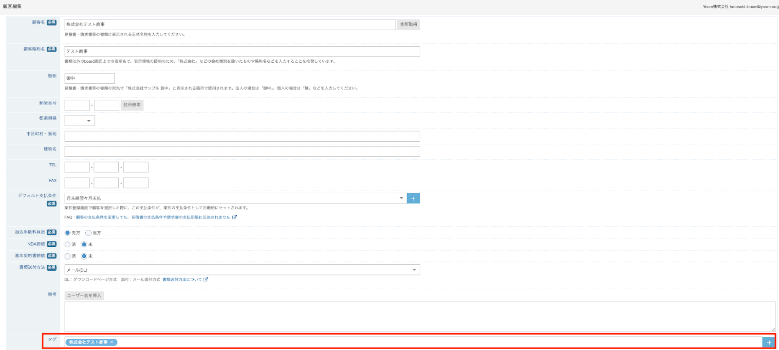 今回は以下の通り、テスト用に「株式会社テスト商事」を顧客として登録し、同じ名称のタグを設定しておきました。