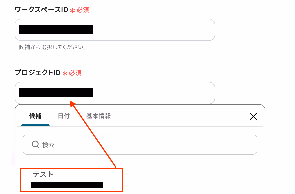「ワークスペースID」と「プロジェクトID」は、以下の画像のように入力バーをクリックすると表示される候補から、該当するものをクリックしましょう。