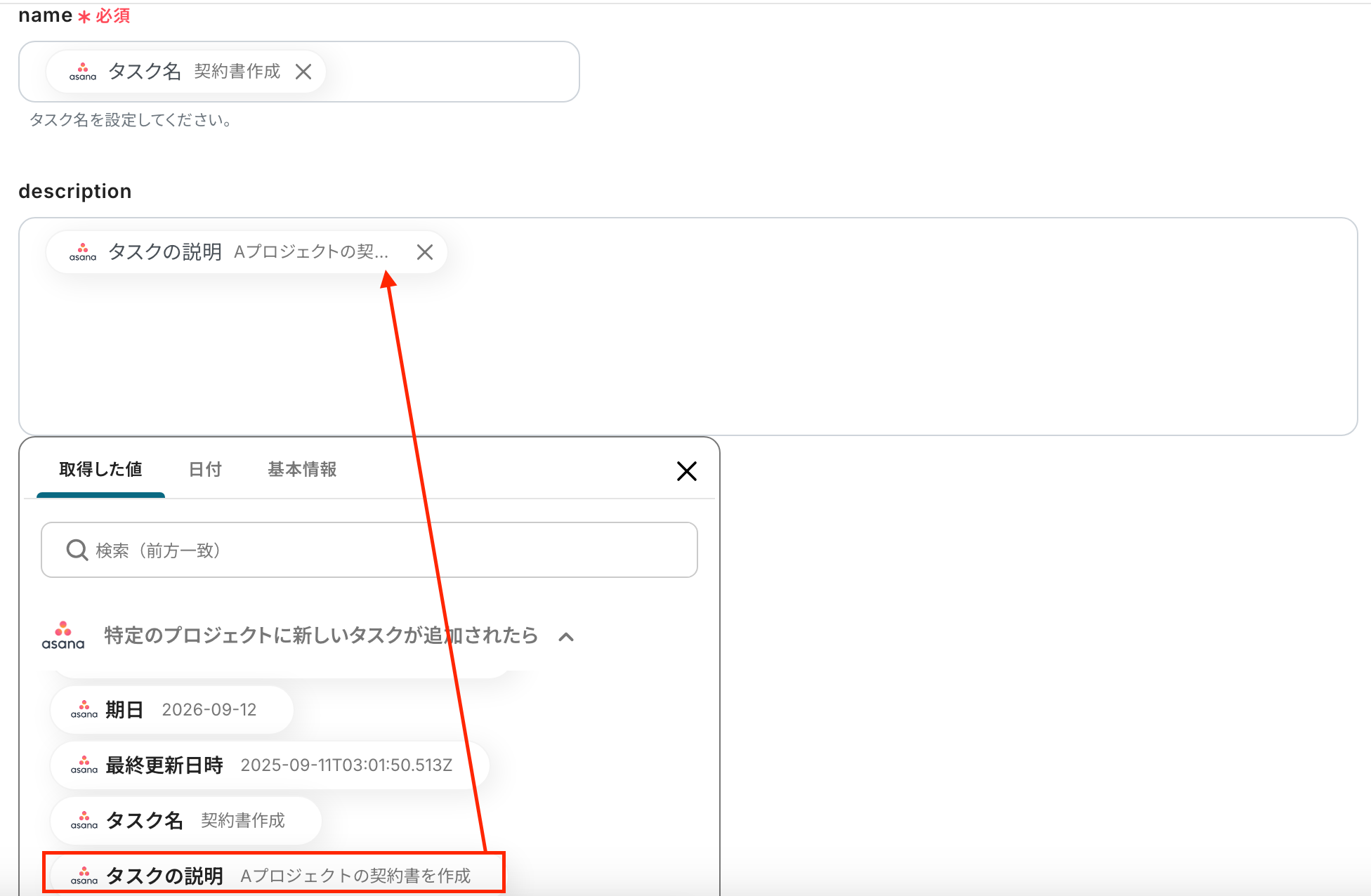 「name」や「description」は、入力欄をクリックして表示される取得した値から選択してください。