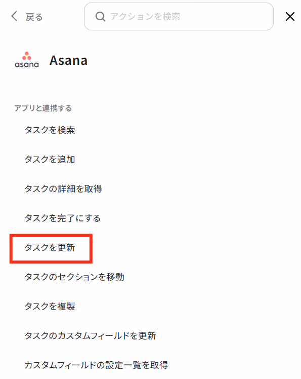 下記の画面でAsanaと検索し、「タスクを更新」アクションを設定してください。