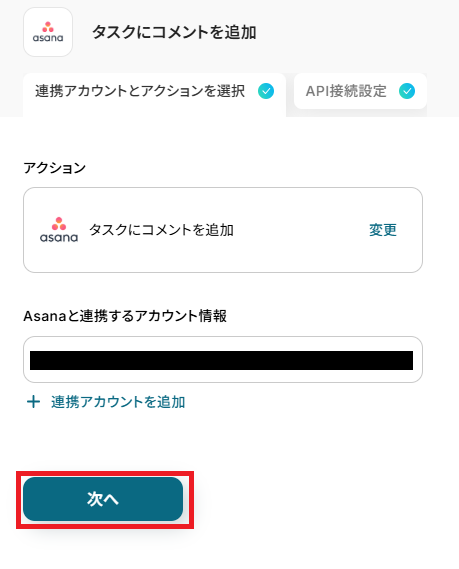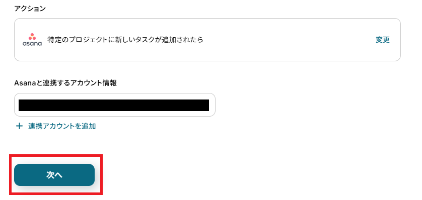 Asanaと連携するアカウント情報を確認し、アクションはそのままでOKです。 確認したら「次へ」で進みます。