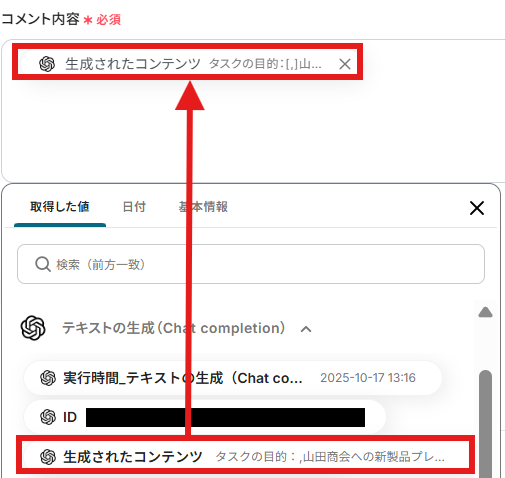 コメント内容も取得した値より「生成されたコンテンツ」を設定します。