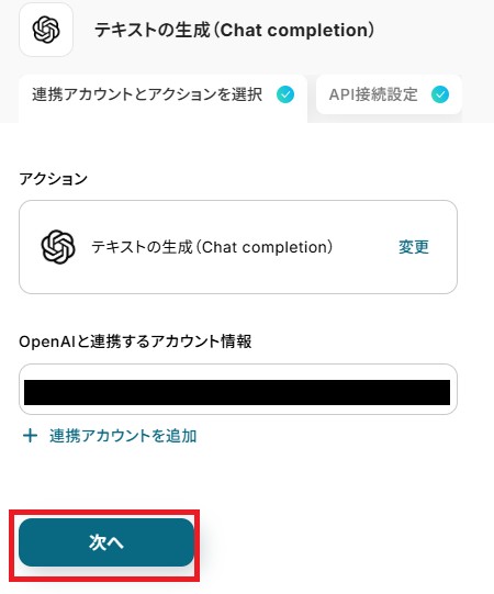 OpenAIと連携するを行うアカウントを確認し、アクションはそのままで構いません。 問題なければ「次へ」で進みます。