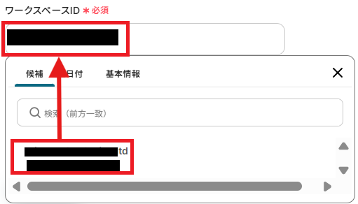 ワークスペースIDとプロジェクトIDは、候補より選択します。
