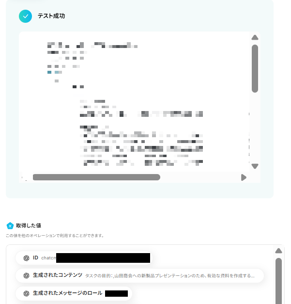 フローボットに戻り、テストボタンを押してください。 テストが成功し、取得した値が入ればOKです。