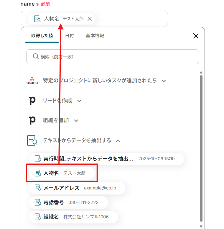 トリガーやオペレーション設定時に、「テスト」を実行して取得した値です。
