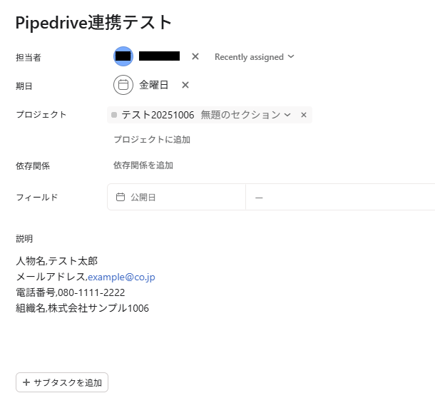 テスト用のため、タスクの内容は架空の情報(「株式会社test」や「テスト太郎」など)でOKです!