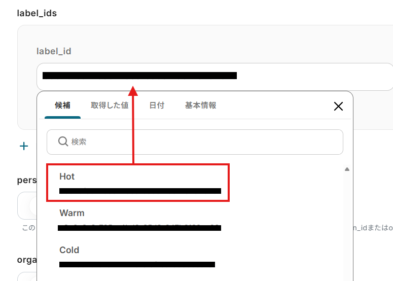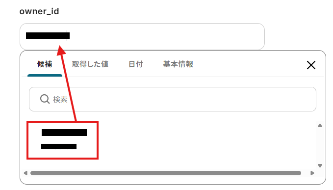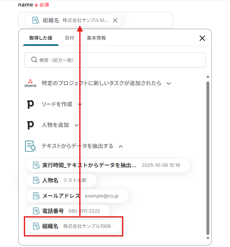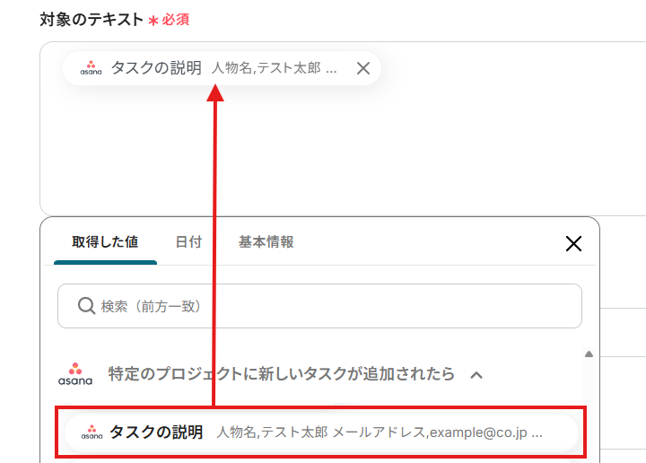 「対象のテキスト」は、入力欄をクリックして表示される取得した値から選択できます。
