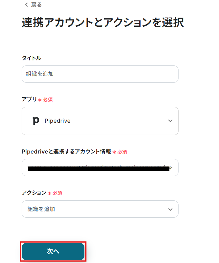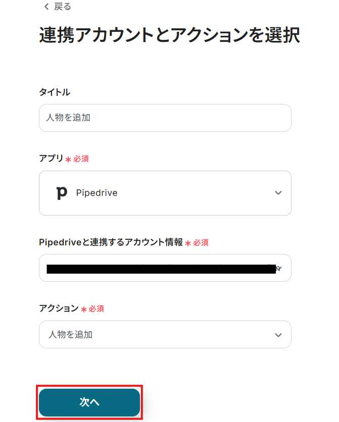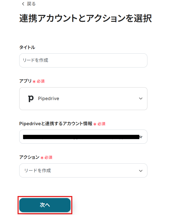 連携するアカウント情報には、ステップ1で連携したアカウント情報が反映されています。トリガーアクションはそのままにして、「次へ」をクリックしてください。