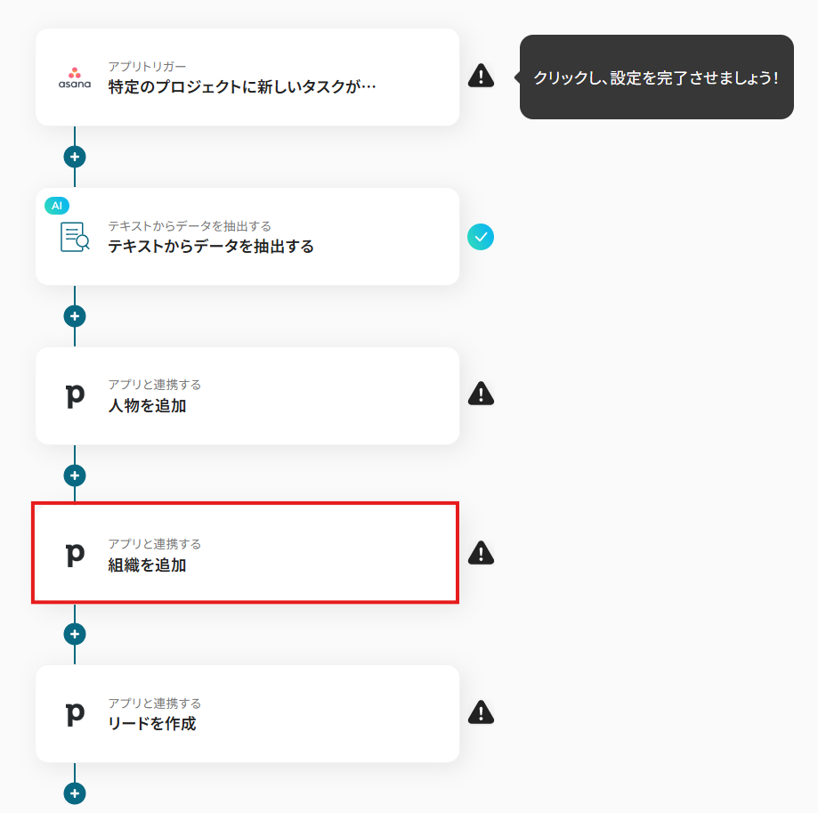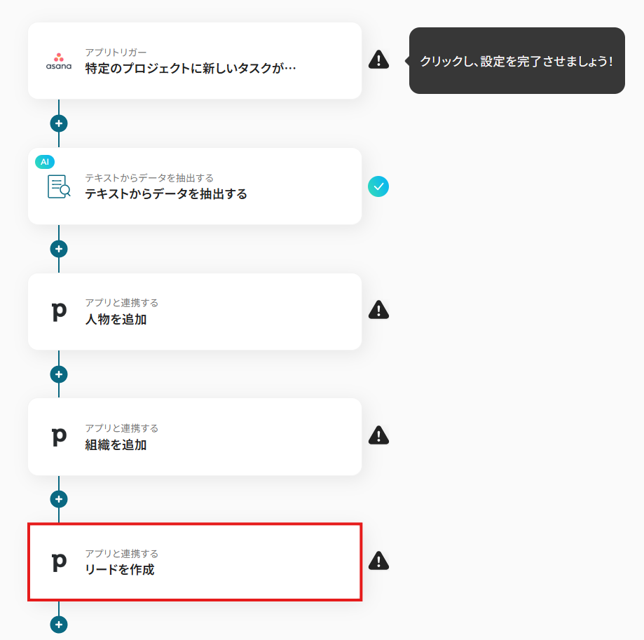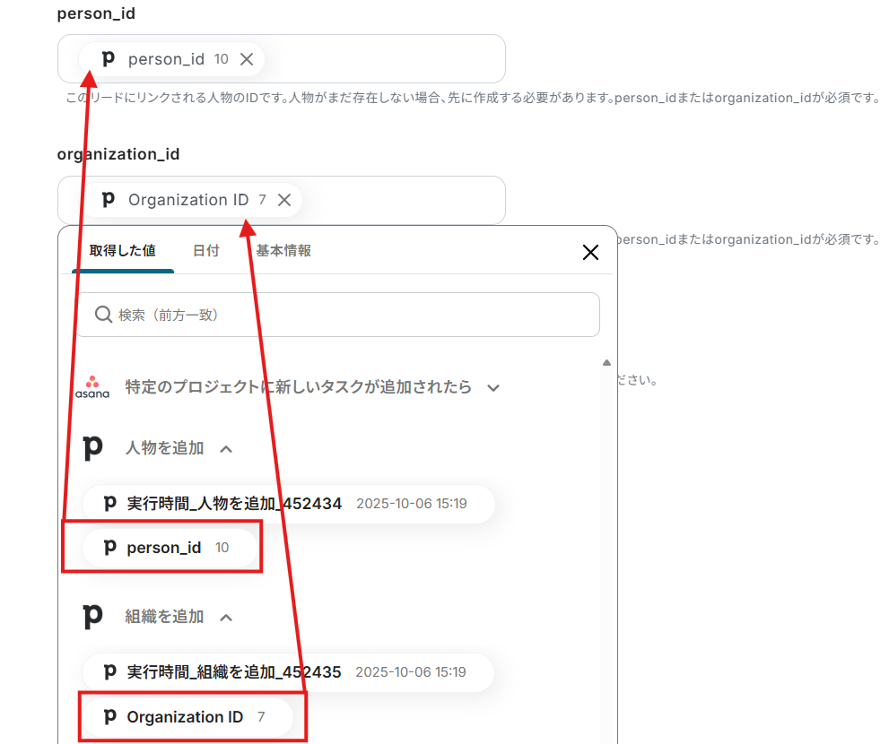 このワークフローを活用すれば、Asanaで特定のプロジェクトにタスクが追加されると、Pipedriveに紐づく人物・組織情報と共に新しいリードが自動で作成されます。
