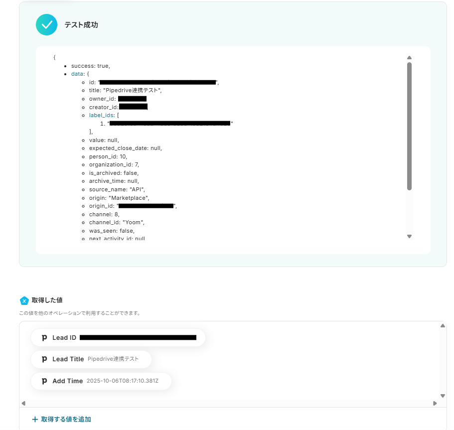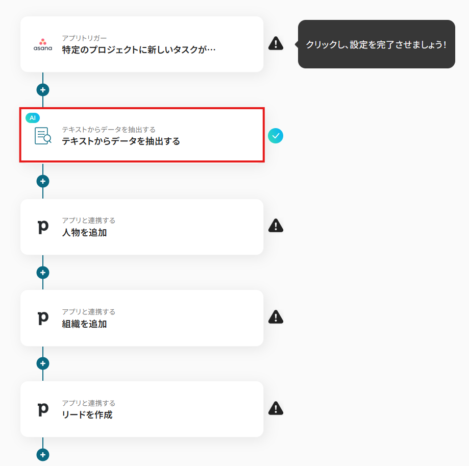 ここで抽出したテキストデータを用いて、Pipedriveにデータを追加するため、Pipedriveに追加したい項目を全て設定するようにしましょう。