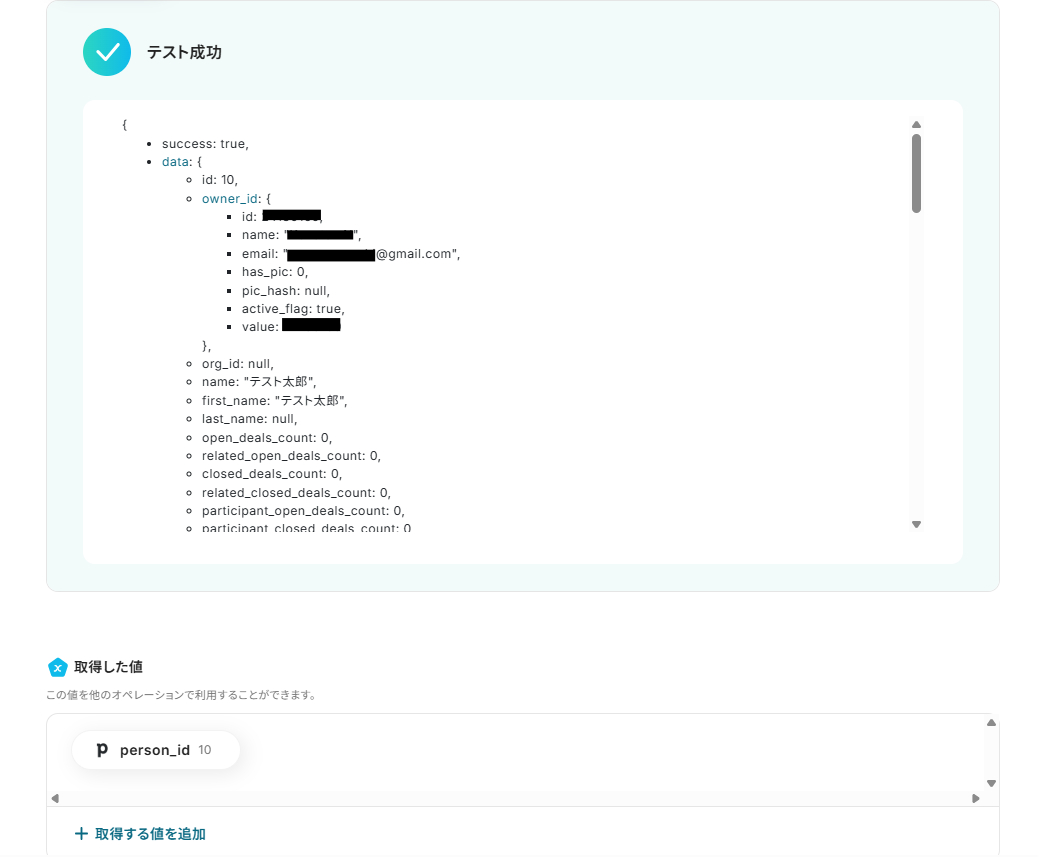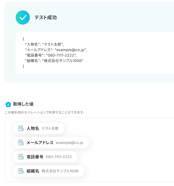 5.入力を終えたら「テスト」をクリックし、「取得した値」にデータが抽出されていることを確認してください。