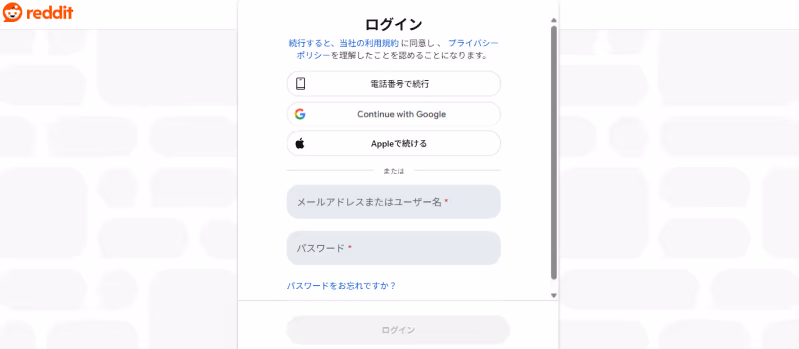 Redditに登録しているメールアドレスとパスワードを入力し「ログイン」ボタンをクリックしてください。