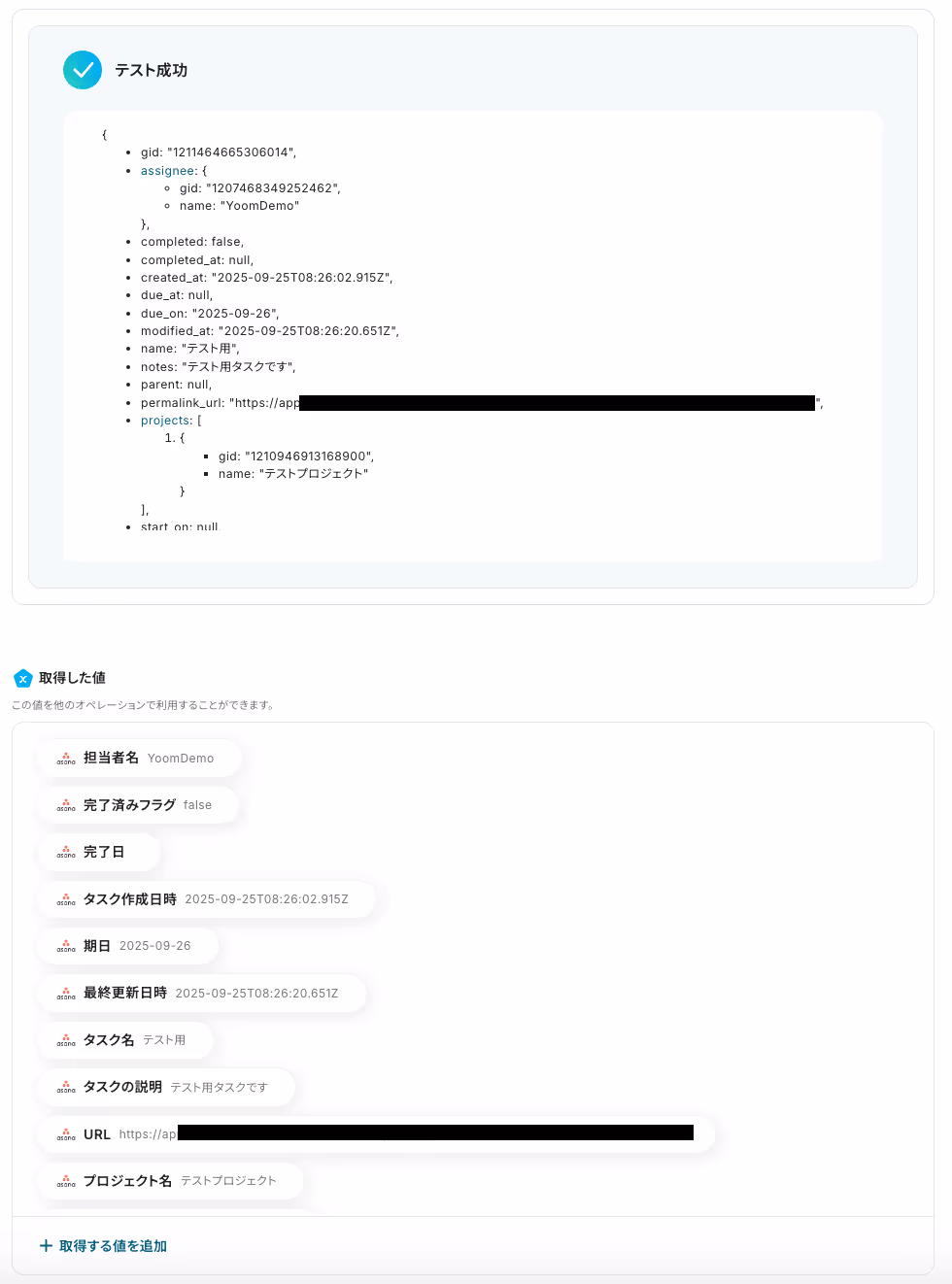 入力を終えたら「テスト」を実行し、 「取得した値」を確認してください。