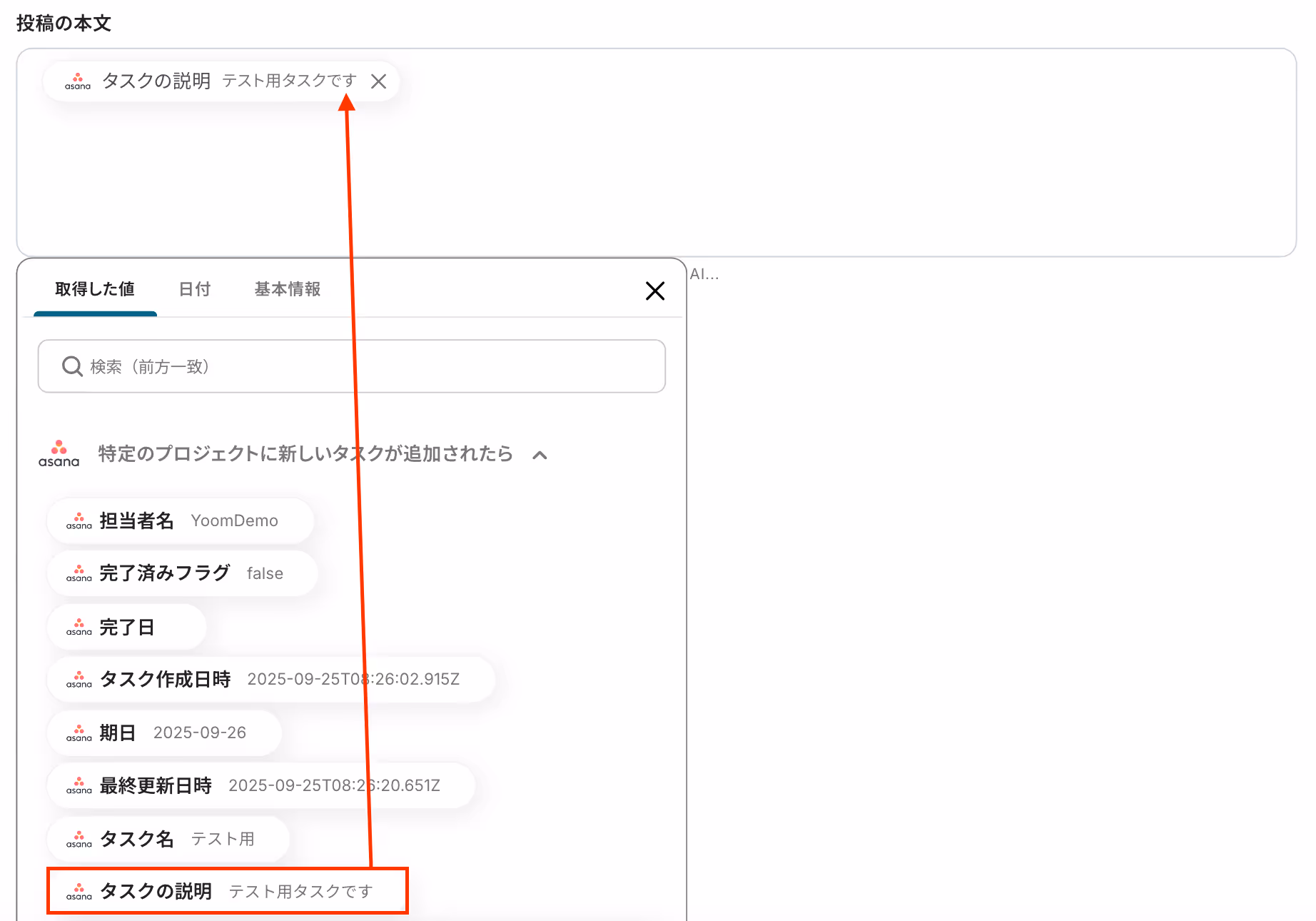 トリガーやオペレーション設定時に、「テスト」を実行して取得した値のことを指します。