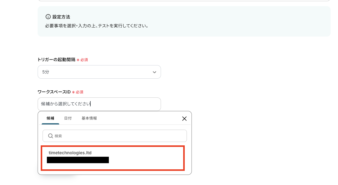 「ワークスペースID」と「プロジェクトID」は、連携したアカウントから引用した情報を『候補』から選択して設定しましょう。