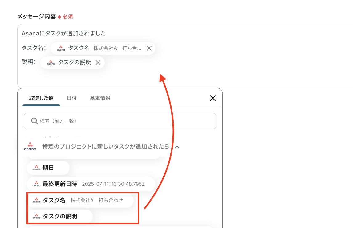「メッセージ内容」では、入力バーをクリックすると、前ステップから取得した情報をアウトプットとして引用できます。