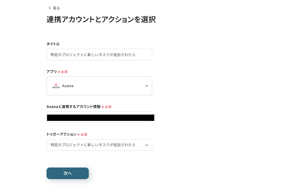まずは、トリガーとなる「特定のプロジェクトに新しいタスクが追加されたら」をクリックして、連携するアカウント情報を入力してください。