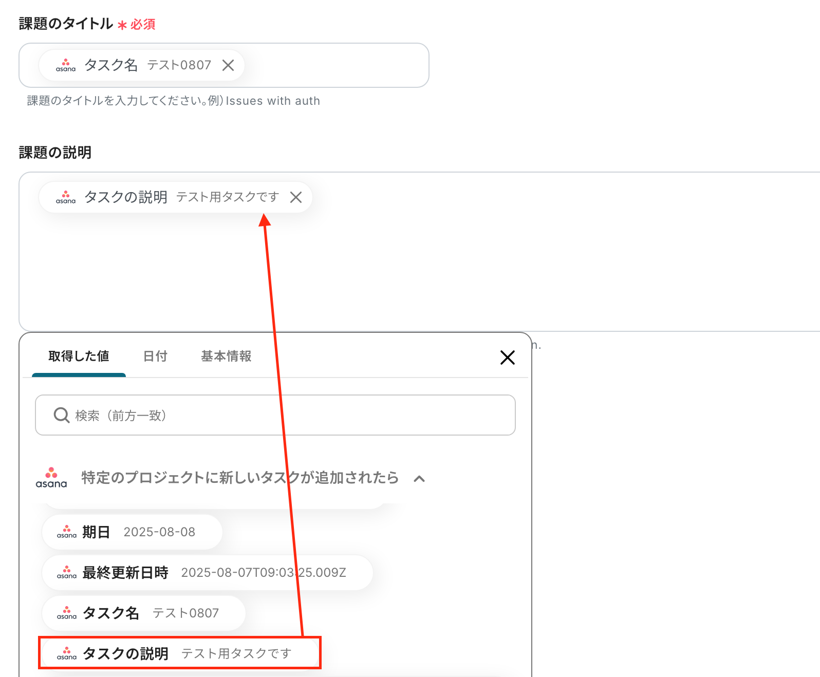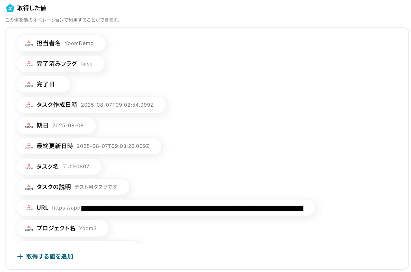 - 最後に、オペレーションでAsanaを選択し、「タスクを追加」アクションを設定して、GitLabのイシュー情報を基にタスクを作成します