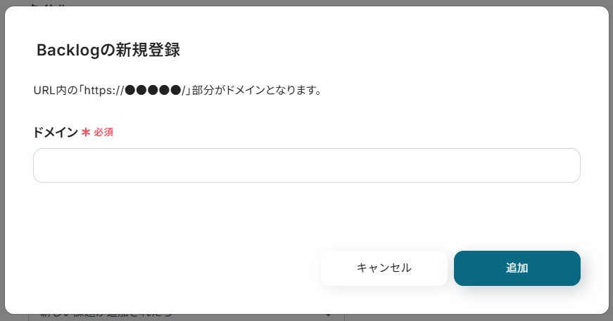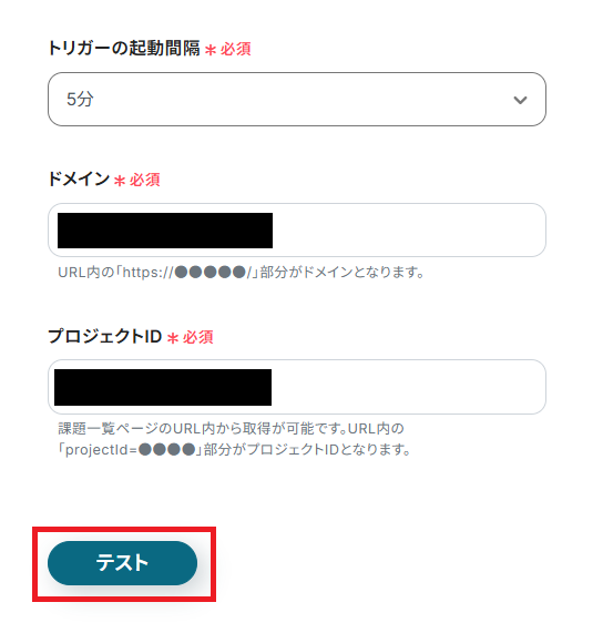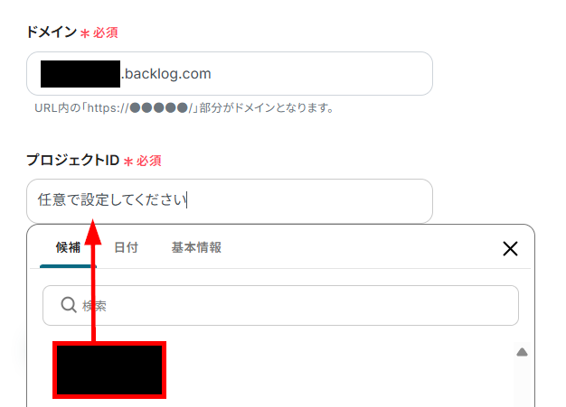 Backlogのドメインを注釈に沿って入力し、課題を追加するプロジェクトIDを候補から設定します。