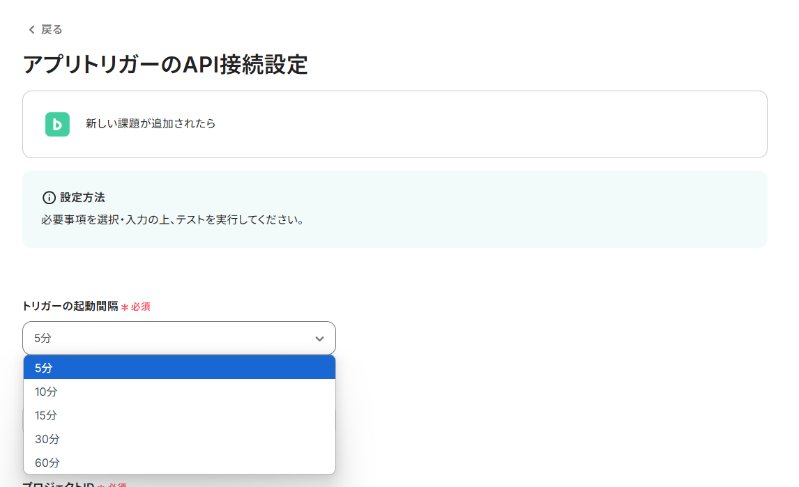 - トリガーの起動間隔は、選択した時間毎に一度、Backlogでトリガーとなるアクション(新しい課題の追加)が行われたかを確認し、アクションが行われている場合にフローボットが起動します。
