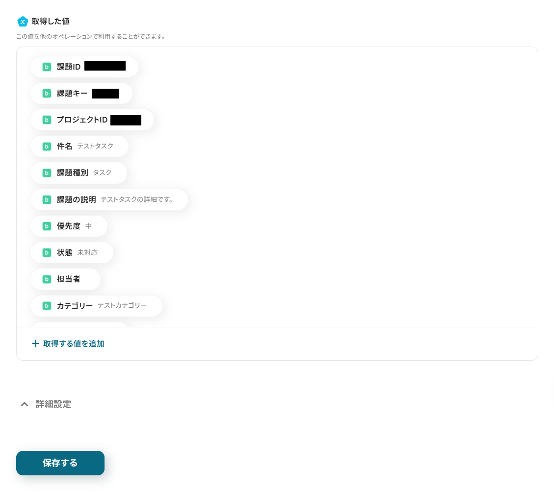 テストが成功すると、Backlogに追加した課題の情報が取得されるので保存しましょう。
