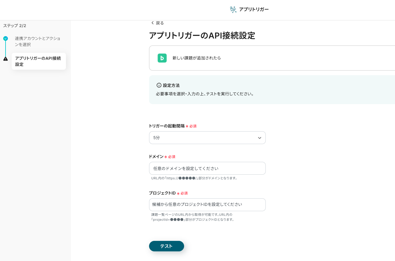プロジェクトIDの入力までできたら、トリガーになるイベントを発生させます。該当のプロジェクト内で新しく課題を追加します。