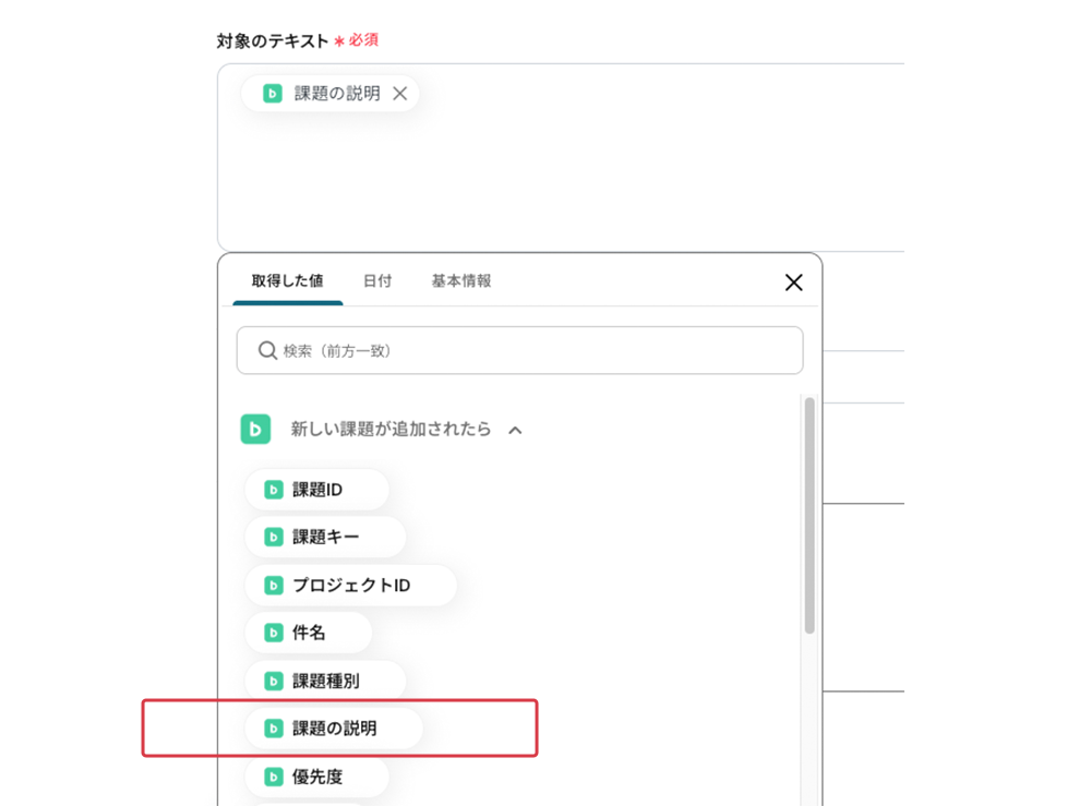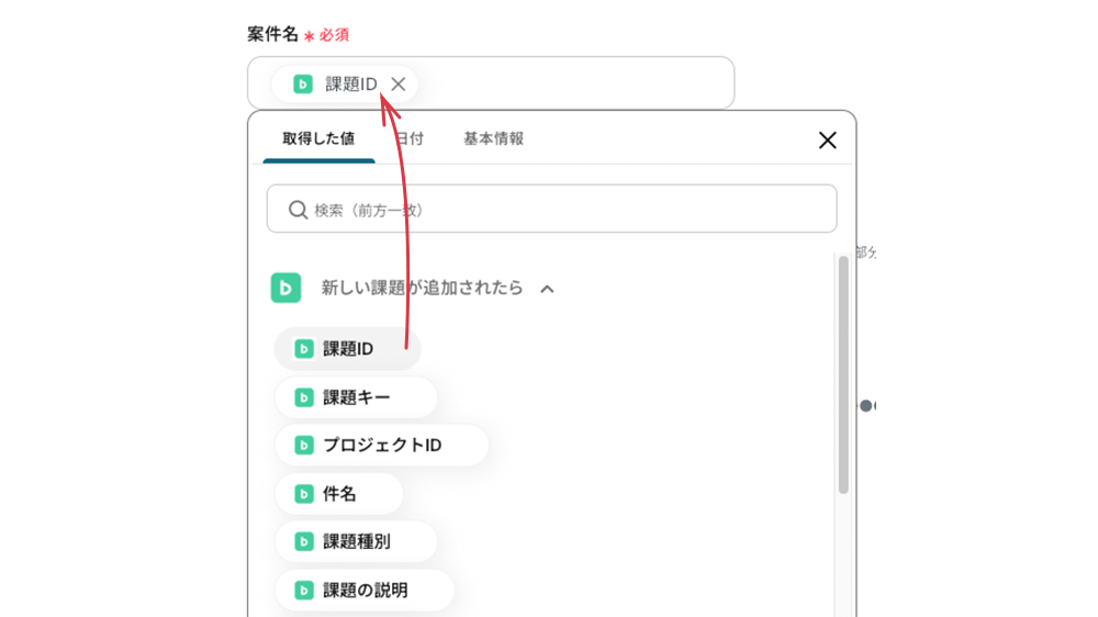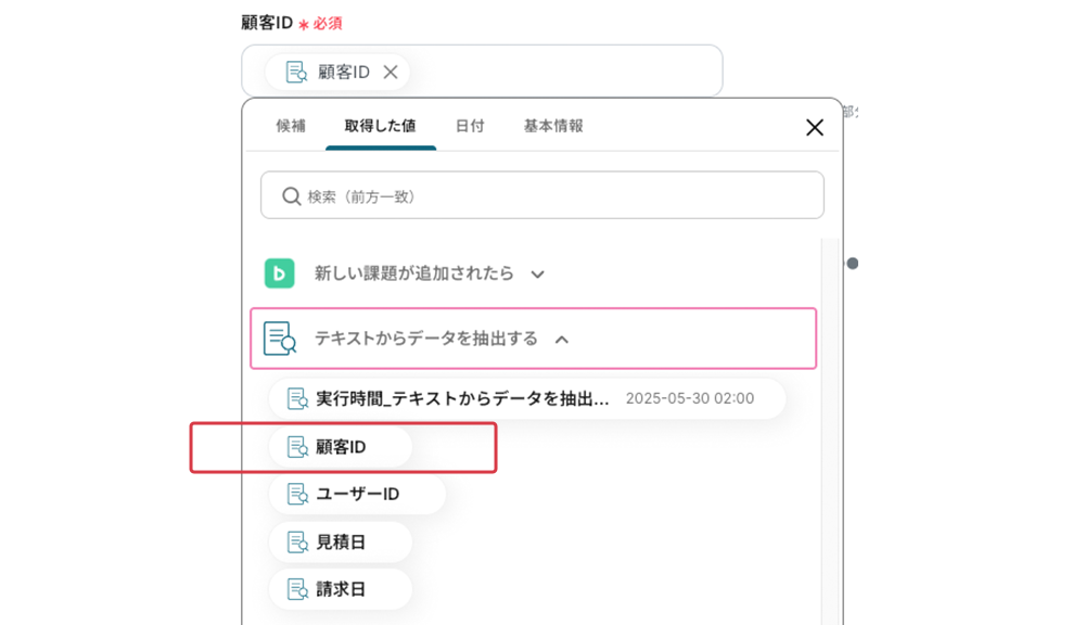 - 事前設定で顧客IDの引用コードが埋め込まれているため追加操作は不要です。この引用コードは、前の工程で抽出したテキストです。フィールドをクリックして表示されるプルダウンメニュー内で選択できます。