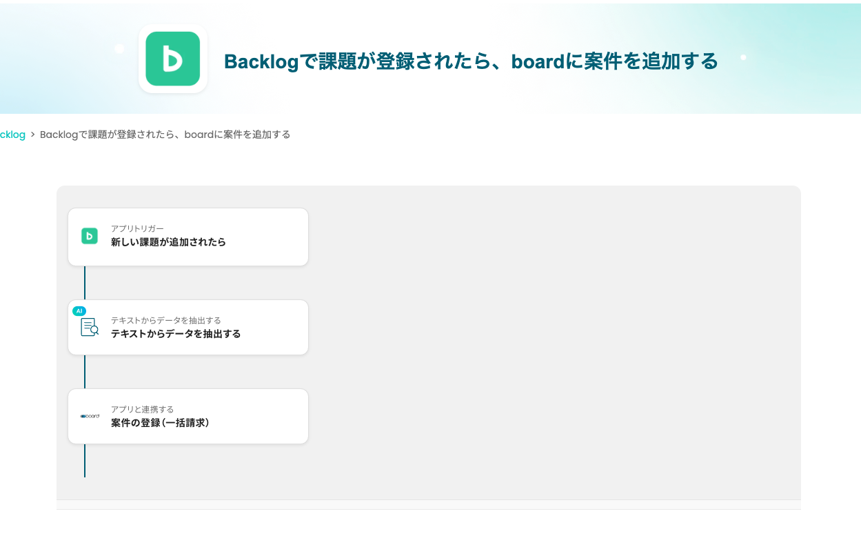 今回はBacklogからboardへデータを連携する方法をご紹介しましたが、逆にboardからBacklogへのデータ連携を実施したい場合もあるかもしれません。例えば、boardで新しい案件が作成された際に、Backlogに関連する課題を自動で起票したいといったケースです。そのような場合は、下記のテンプレートも併せてご利用ください。