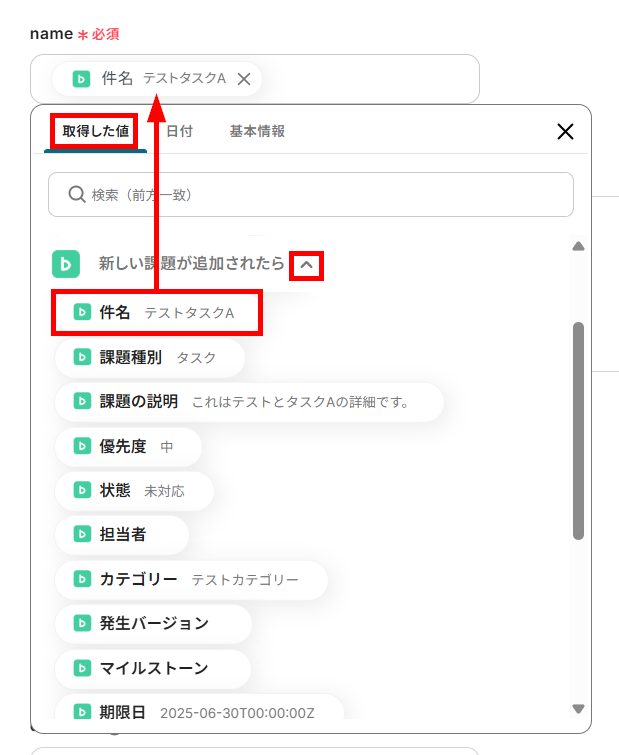nameなど、Backlogの内容を反映させる項目は、取得した値から対応する項目を設定してください。