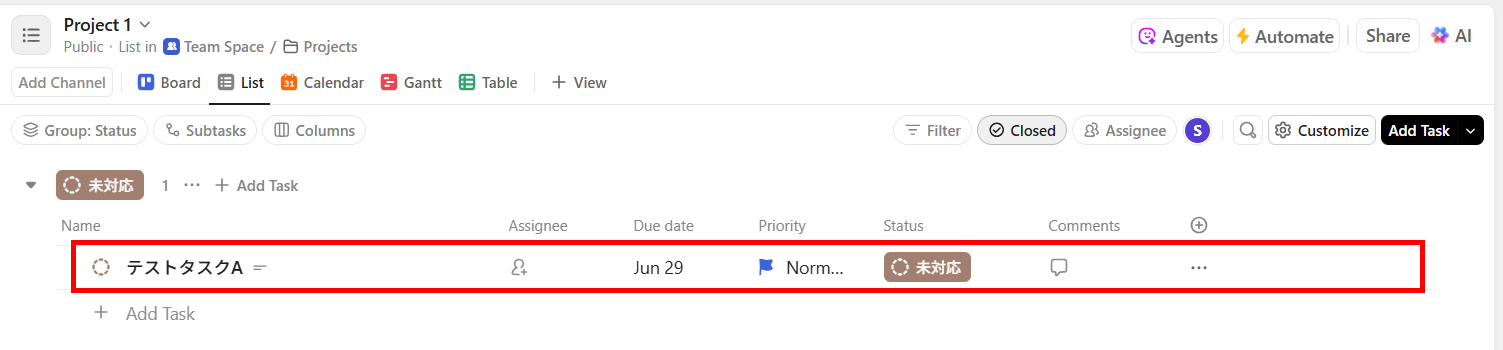 テストが成功すると、ClickUpにタスクが追加されます。