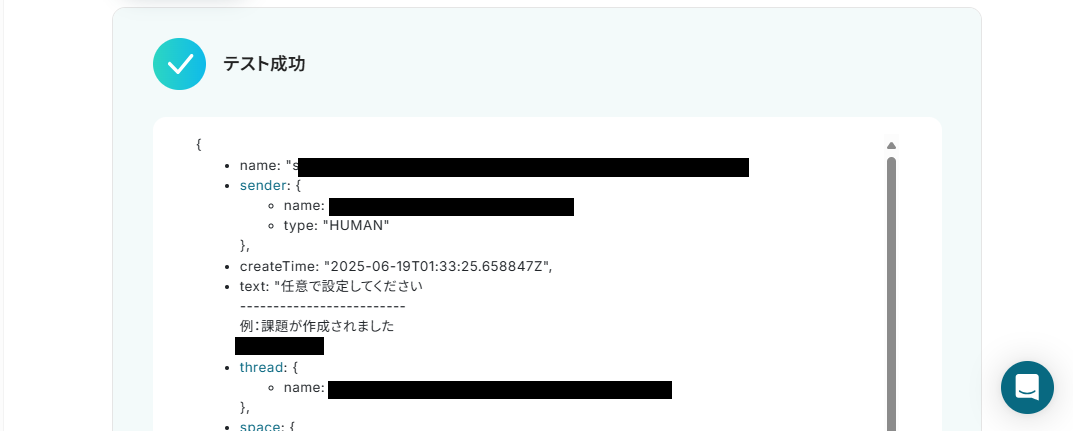 テストが成功し、下記のような表示がされるとGoogle Chatにテストのメッセージが届きます。